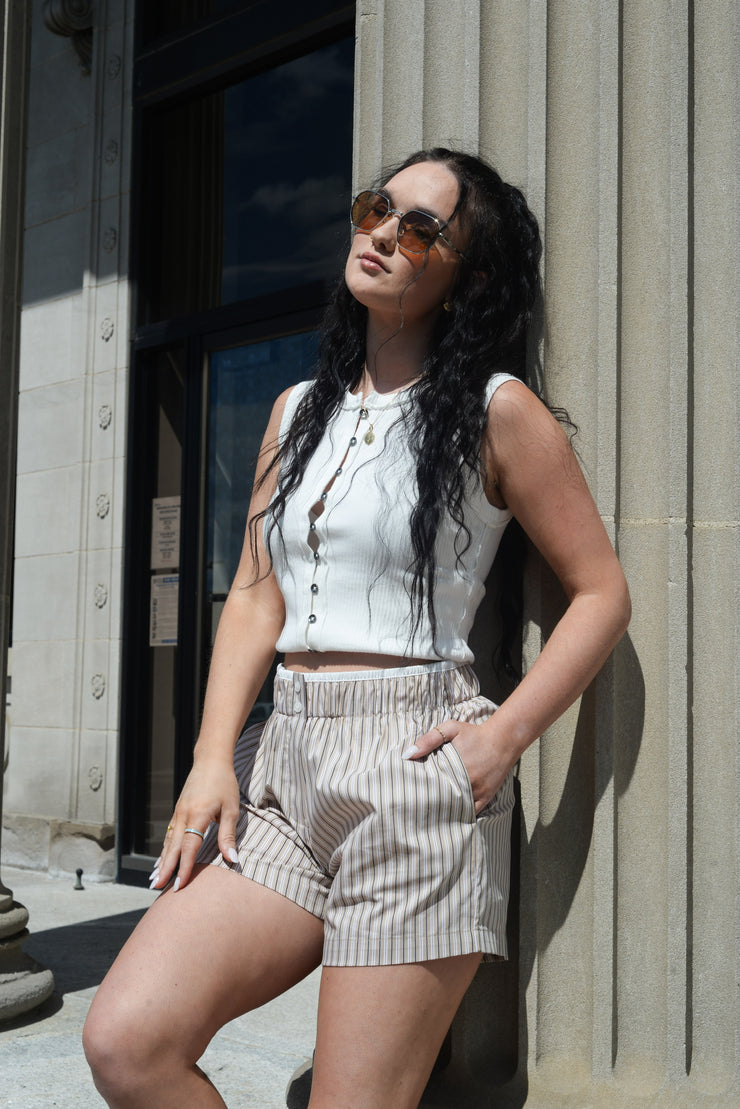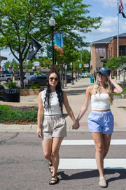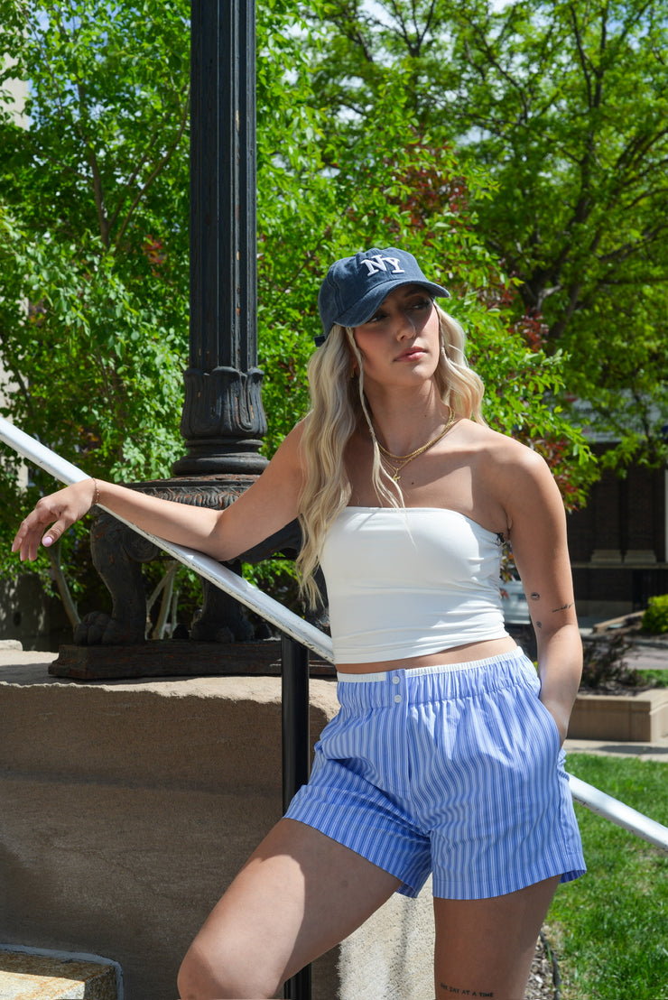 The boxer short isn't going anywhere this season, and we are thrilled! Such a cool girl staple. Model in blue in size small, khaki in size medium!