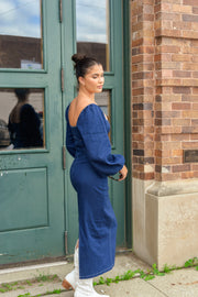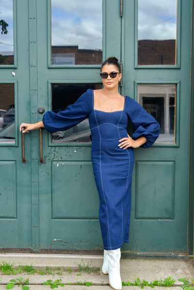 This denim midi dress is quite possibly too chic. Thick, stretchy denim helps create that snatched, hourglass shape. Zipper closure, model in size small.