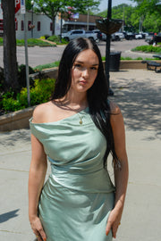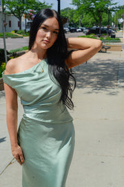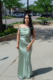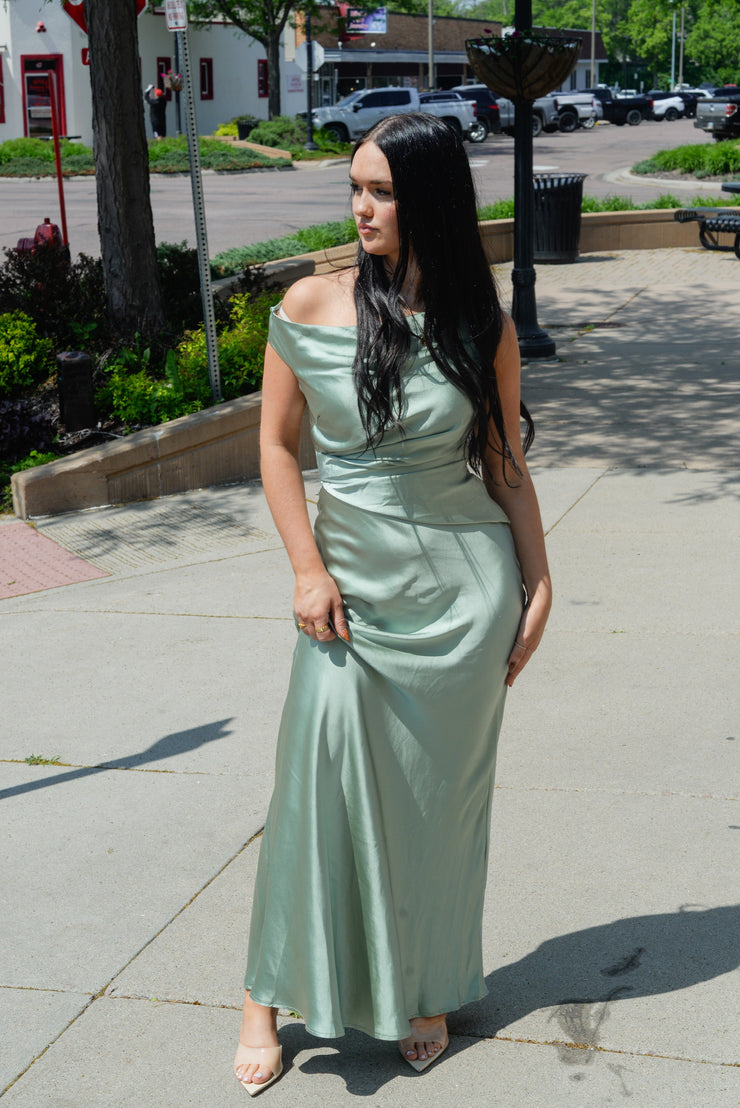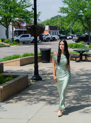 Elegant. Gorgeous. Stunning. This satin dress is a flattering fit and a timeless style! Model in size small.