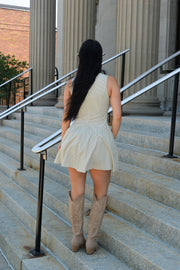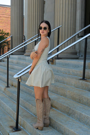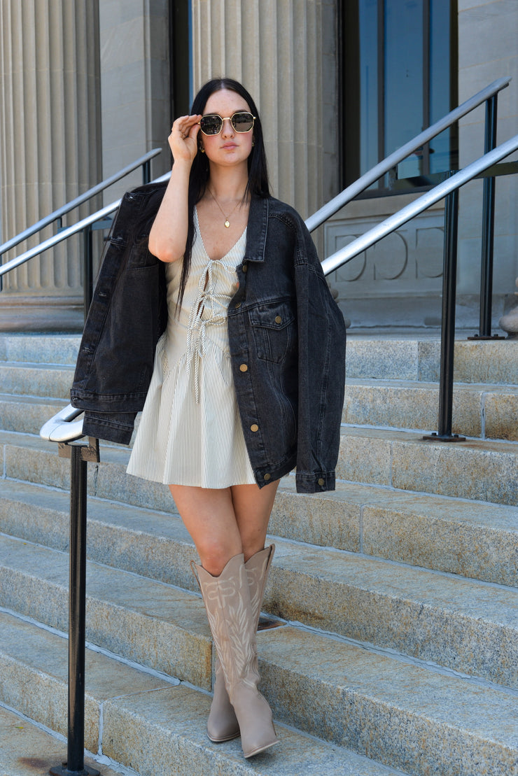 A flirty mini that can be dressed up or down! Zipper closure in back + adjustable front ties. Model in size small!