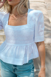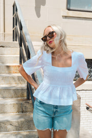 Pretty & feminine, this top has the best shape & ads flair to any fit. Button closure at back of neck, stretchy bodice, peplum style. Model in size small!