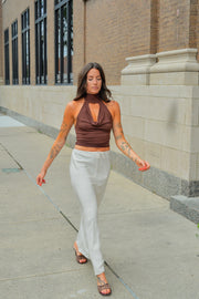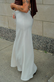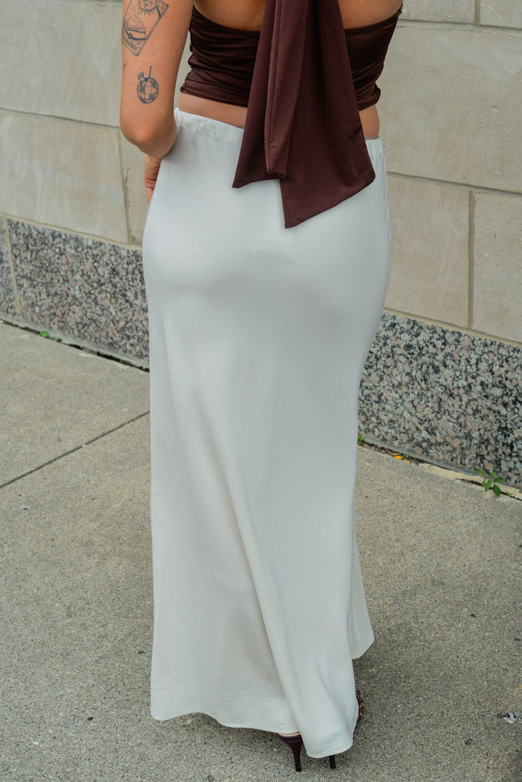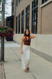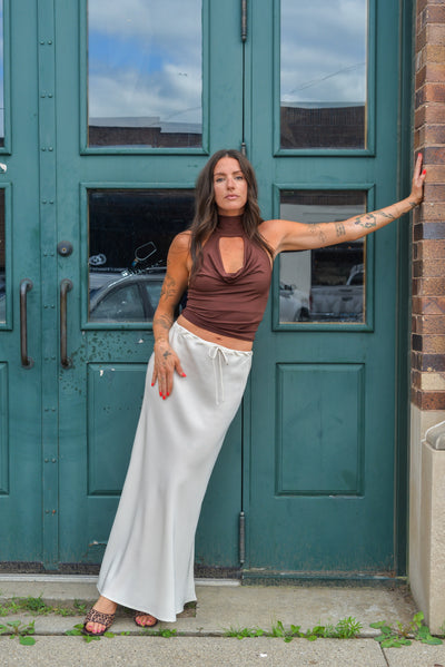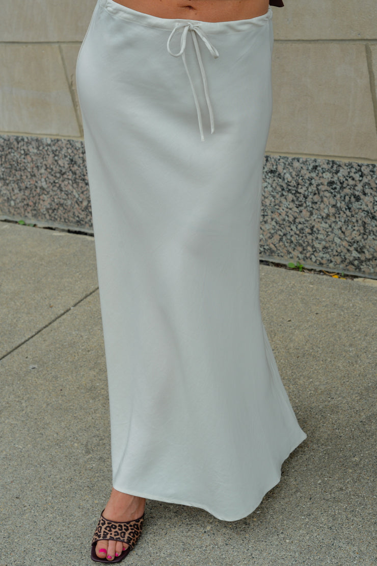 A chic maxi skirt that can be dressed up for a corporate job, worn out to date night, or paired with boots for a country concert. Can be worn low on the hips or high rise. Tie closure. Model in size small.