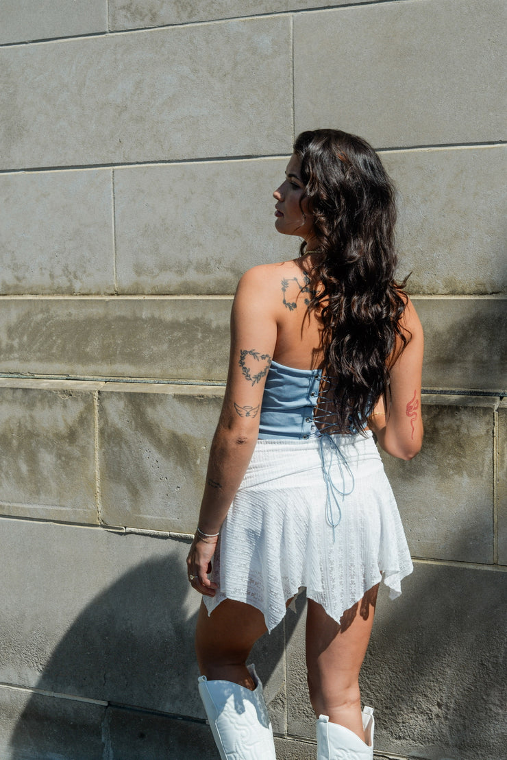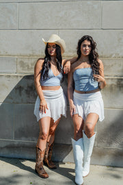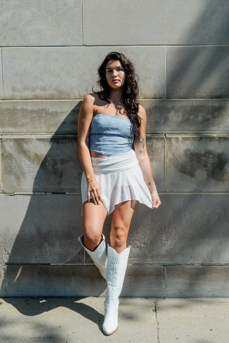 Country concert, anyone?? This lace mini skort has a foldover waist for the most flattering, country girl fit. Also comes in black! Models in size small & medium.